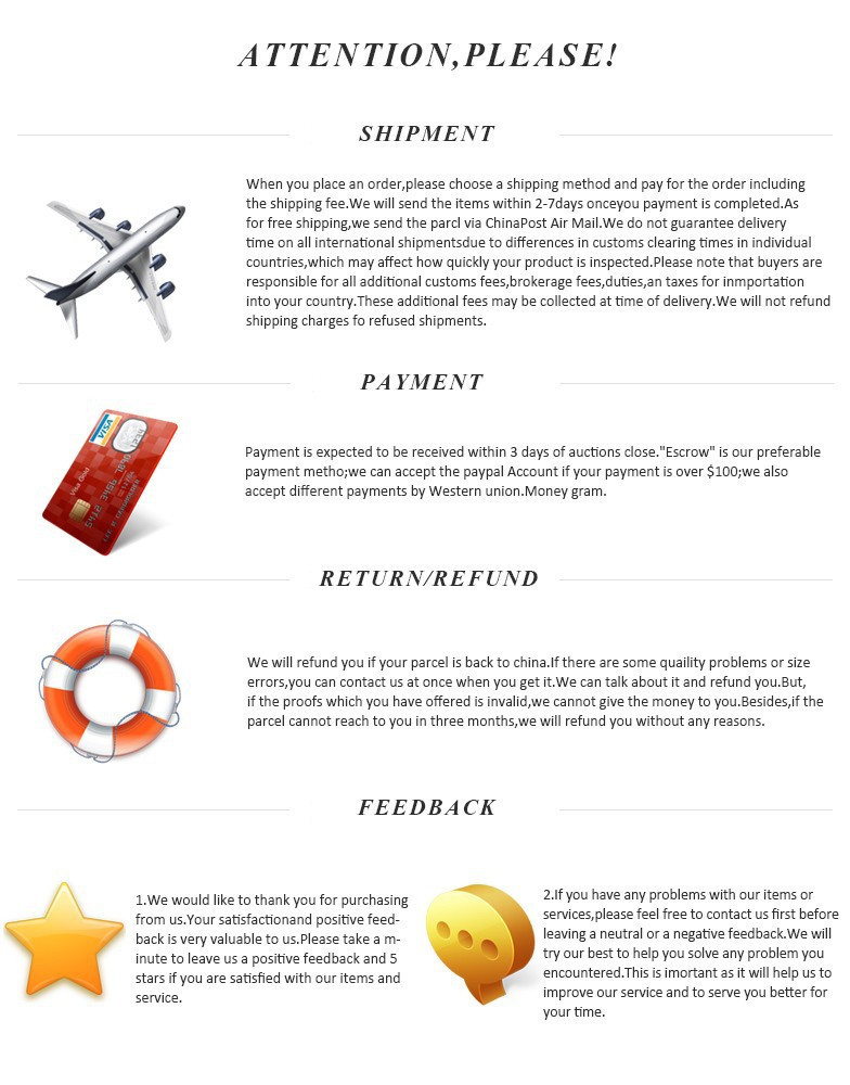 | Return Policy | If the product you receive is not as described or low quality, the seller promises that you may return it before order completion (when you click "Confirm Order Received" or exceed confirmation timeframe) and receive a full refund. The return shipping fee will be paid by you. Or, you can choose to keep the product and agree the refund amount directly with the seller. N.B.: If the seller provides the "Longer Protection" service on this product, you may ask for refund up to 15 days after order completion. |